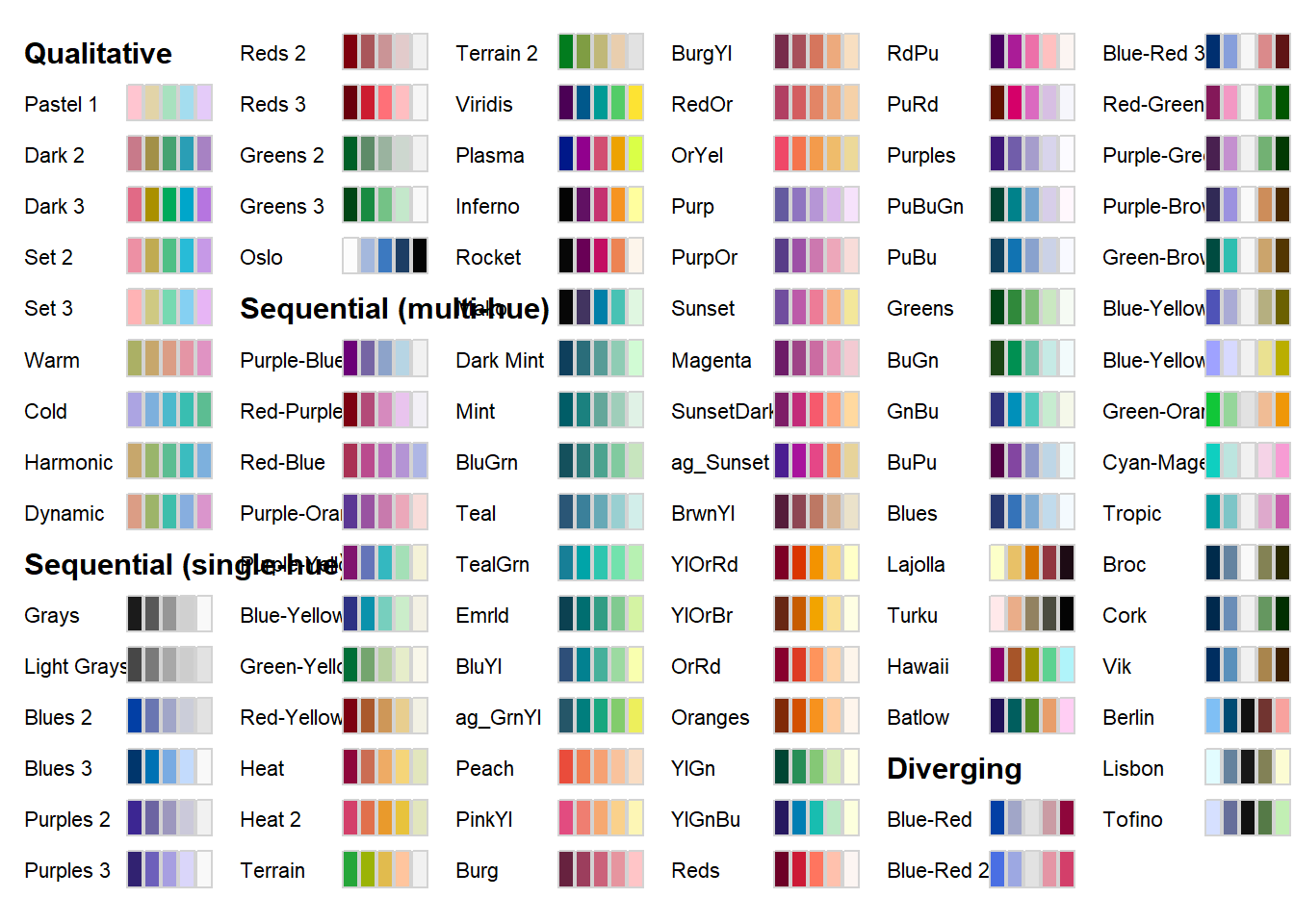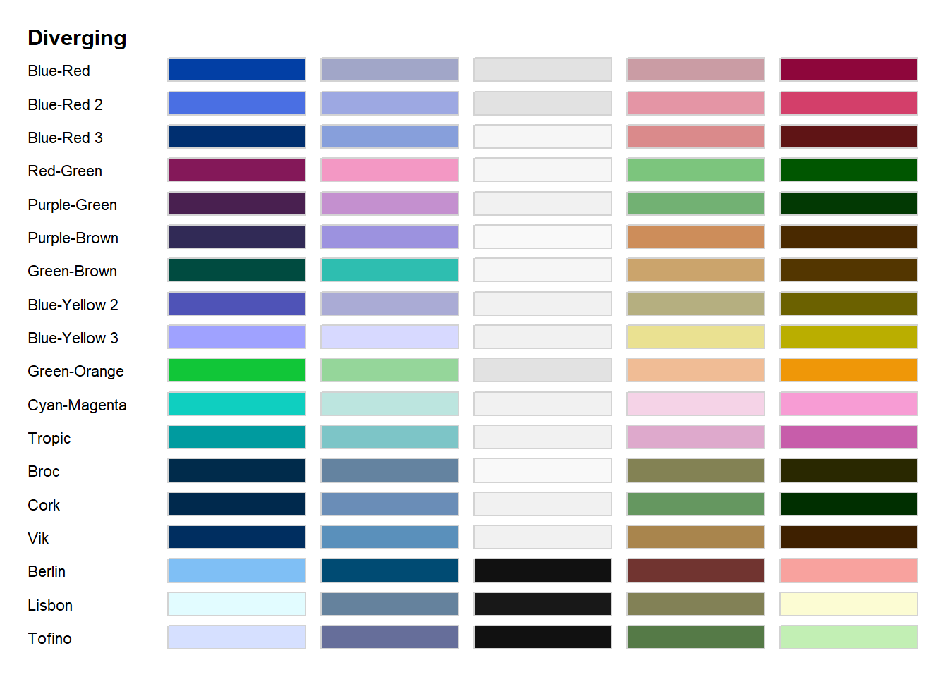 ## HCL palettes ## ## Type: Qualitative ## Names: Pastel 1, Dark 2, Dark 3, Set 2, Set 3, Warm, Cold, Harmonic, Dynamic ## ## Type: Sequential (single-hue) ## Names: Grays, Light Grays, Blues 2, Blues 3, Purples 2, Purples 3, Reds 2, ## Reds 3, Greens 2, Greens 3, Oslo ## ## Type: Sequential (multi-hue) ## Names: Purple-Blue, Red-Purple, Red-Blue, Purple-Orange, Purple-Yellow, ## Blue-Yellow, Green-Yellow, Red-Yellow, Heat, Heat 2, Terrain, ## Terrain 2, Viridis, Plasma, Inferno, Rocket, Mako, Dark Mint, ## Mint, BluGrn, Teal, TealGrn, Emrld, BluYl, ag_GrnYl, Peach, ## PinkYl, Burg, BurgYl, RedOr, OrYel, Purp, PurpOr, Sunset, ## Magenta, SunsetDark, ag_Sunset, BrwnYl, YlOrRd, YlOrBr, OrRd, ## Oranges, YlGn, YlGnBu, Reds, RdPu, PuRd, Purples, PuBuGn, PuBu, ## Greens, BuGn, GnBu, BuPu, Blues, Lajolla, Turku, Hawaii, Batlow ## ## Type: Diverging ## Names: Blue-Red, Blue-Red 2, Blue-Red 3, Red-Green, Purple-Green, ## Purple-Brown, Green-Brown, Blue-Yellow 2, Blue-Yellow 3, ## Green-Orange, Cyan-Magenta, Tropic, Broc, Cork, Vik, Berlin, ## Lisbon, Tofino