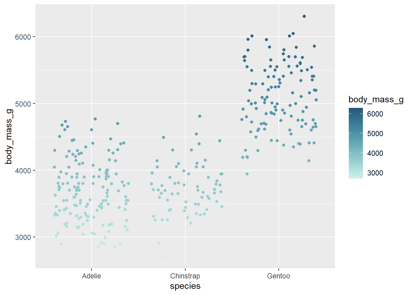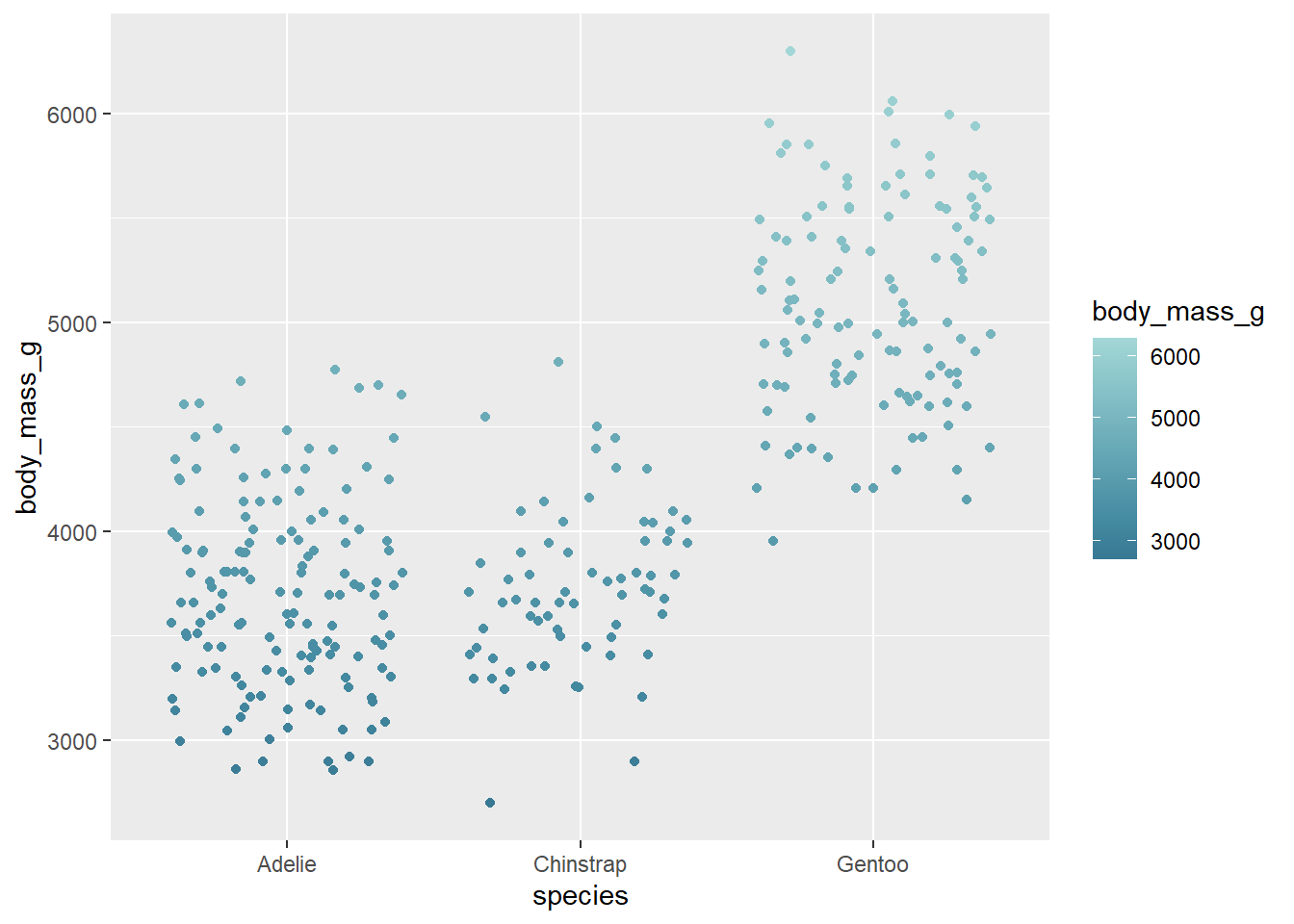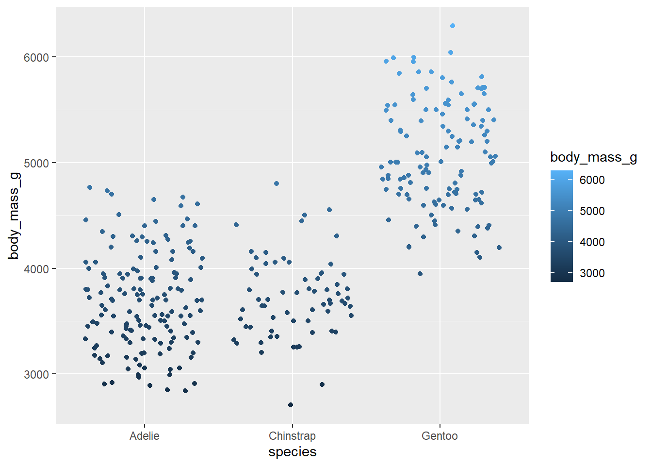 일단 각 펭귄 종류별로 몸무게(body_mass_g)에 따라 점 색깔이 변하도록 기본적인 그래프를 그려보겠습니다.