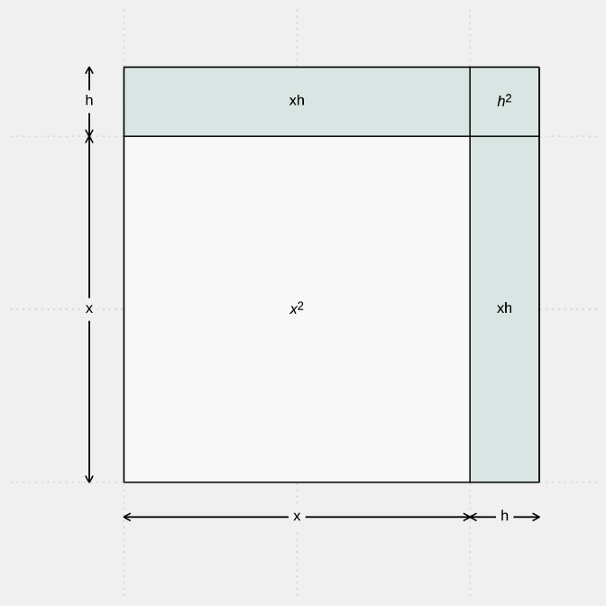 위에 있는 그림에서도 넓이가 $xh$인 직사각형 2개, $x^2$인 정사각형 하나를 찾을 수 있습니다.